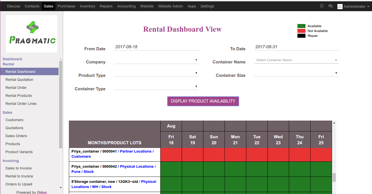 OverviewOdoo Rental Bundle FeaturesRental DashboardRental Order DetailsRental Product DetailsSearch Booking and much moreOdoo Rental Management AppWith our integrated rental management solutions, we at Pragmatic Techsoft Pvt. Ltd have carved a distinctive niche for ourselves. As a cohesive unit of business solutions experts, we have what it takes to devise dynamic rental management strategies. Rental Order DetailsIn Rental order form you can fill details of Customer, Order reference, and rental product details. Rental Product Details In Rental product details, we can have information like rental start date, expected end date, location from which product should be deliver(not mandatory, pick default location if not provided any ), monthly rental, daily rental(unit price), current stock update location wise. Odoo Rental Dashboard AppWith our integrated rental management app, we at Pragmatic Techsoft Pvt. Ltd have created add-ons feature for our rental app, to see Rental booking details with the help of Dashboard. Looking into inventory valuation will not give you a broader picture of booking details whereas Dashboard will give a clear picture of current and future bookings. It is also possible to book product from dashboard and same product can be booked for various duration. In Rental dashboard form you can have filters like start date, end date, product type, company etc. Booking SearchBased on filters, product will get searched and show you dashboard. You can see current, future and history of booking through this dashboard with the help of selecting date range. You can book product using this dashboard also, default data will pass on to rental quotation.