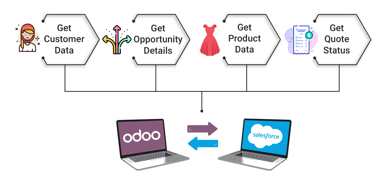 Odoo SalesForce ConnectorSalesforce is the innovative company behind the world's #1 CRM platform. Salesforce software is cloud-based, so it doesn't require a team of IT experts to set up or manage - you just log in and start using it. Faster, Cheaper. Easier. Better. Salesforce takes your business to the next level. Salesforce's customer relationship management software instantly streamlines and automates your business processes. By creating infrastructure-as-a-service, your business allows sales, marketing, and support teams to work in sync and see important sales and customer data with more width and breadth, freeing them up to generate new clients and better service existing ones. Features Comparison with Other ConnectorsCompanyPragmaticOdoo-Ology Pvt LtdTechloyceSynchronize SF AccountsSynchronize ProductsSynchronize ContractsSynchronize OrdersSynchronize QuotesSynchronize CustomersSynchronize EventsSynchronize ContactsSynchronize LeadsSynchronize OpportunitiesSynchronize ProductsSynchronize LeadsSynchronize OpportunitiesSynchronize ContractsImport OrdersImport QuotesAutomatic JobsOdoo SalesForce Connector Features Import contacts Export contacts Import Products Export Products Import accounts Export accounts Import quotations Export quotations Importing sales order Exporting sales order Importing Leads Exporting Leads Importing Opportunity Exporting Opportunity Importing Contract Exporting Contract Importing Events Exporting Events Importing Task Exporting Task Odoo to Salesforce - Import Export OperationsExport/Update Products to Salesforce from Odoo.Export/Update Customers/Contacts to Salesforce from Odoo.Export/Update Sale Orders to Salesforce from Odoo.Export/Update Quotes to Salesforce from Odoo.Export/Update Opportunities to Salesforce from Odoo.Export/Update Leads to Salesforce from Odoo.Export/Update Products to Salesforce from Odoo.Export/Update Customers/Contacts to Salesforce from Odoo.Export/Update Sale Orders to Salesforce from Odoo.Export/Update Quotes to Salesforce from Odoo.Export/Update Opportunities to Salesforce from Odoo.Export/Update Leads to Salesforce from Odoo.Between Odoo & Salesforce - Synchronize OperationsSynchronize upcoming Customers to Salesforce from Odoo.Synchronize upcoming Contacts to Salesforce from Odoo.Synchronize upcoming Opportunities to Salesforce from Odoo.Synchronize upcoming Leads to Salesforce from Odoo.Synchronize upcoming Products to Salesforce from Odoo.Synchronize upcoming Tasks to Salesforce from Odoo.Synchronize upcoming Events to Salesforce from Odoo.Synchronize upcoming Contracts to Salesforce from Odoo.Synchronize(Deletion) upcoming Orders to Salesforce from Odoo.Synchronize(Deletion) upcoming Quotes to Salesforce from Odoo.Odoo has the following import features which will import data from Salesforce to Odoo.Fig.1 Odoo Salesforce Connector is an Odoo App which allows following operations: Above screen shows functionalities i.e.) Importing Contacts, Accounts, Products, Quotations, Sales OrderImporting of Customer from Salesforce to Odoo (With Parent Child Relationship)Fig.2 Above is a contact record along with linked account, Let’s import this Contacts, Click on Import Contacts Button. This will import contacts in res.partner object with parent child relationships( if any).Fig.3 when records are imported we do maintain reference to record in salesforce using its id know as x_salesforce_id field in odoo.Importing Accounts (parent of contacts) in Odoo.Fig.4 If you click on ‘Import Accounts’ in above fig. 1, all the parent of account get imported in Odoo.Fig.5 Individual record imported with contacts and addresses attached similar as in salesforce.Exporting Customers to Salesforce from Odoo (With Parent Child Relationships), Performs Update if Customer Exists in Salesforce.Fig.6 Above is a company record(is_comapny = true) which we will export to salesforce along with a child record.Fig.7 Click on Actions Dropdown, You will see Export to Salesforce Option. Click on that option.Importing Productsfrom Salesforce to OdooFig.8 All the products master from salesforce to odoo get imported once you clicks on ‘Import Products’ button in fig. 1Exporting Products to Salesforce from Odoo, Performs Update if Product Exists in Salesforce. Fig.9 Click on Actions dropdown and click on export to salesforce option. The record will be exported to salesforce.Fig.10 Exported record was created successfully in Salesforce side.Importing Quotations from Salesforce.Fig.11 This is a Quotation Generated in Salesforce, In next step we will see this imported to odoo. Click on Import Quotations button to import all quotes from salesforce as shown fig 1.Fig.12 Quotations was successfully imported along with quotation lines, above is sample record of a quotation.Importing Sales Orders from SalesforceFig.13 Create a order in Salesforce, Above screen shows a order having 4 orderitems. In next Screen we will see how to import it. Click on Import Sales Order Button, This will import all sales order from salesforce as shown in above fig. Fig.14 We see the order was imported from salesforce in odoo Successfully, having state as ‘sale’. We also see its corresponding Delivery Order is also created in odoo automatically.Exporting Quotations to Salesforce from Odoo, Performs Update if Quotations Exist in SalesforceClick on Actions dropdown and click on export to salesforce option. The record will be exported to salesforce.Exporting saleorder to Salesforce from Odoo, Performs Update if saleorder Exists in Salesforce.Click on Actions dropdown and click on export to salesforce option. The record will be exported to salesforce.Importing Leads from salesforce to odoo:All the leads get imported into odoo on click of import lead button Exporting LeadsClick on Actions dropdown and click on export to salesforce option. The record will be exported to salesforce.Importing Opportunities from salesforce to odoo:All the opportunities get imported into odoo on click of import