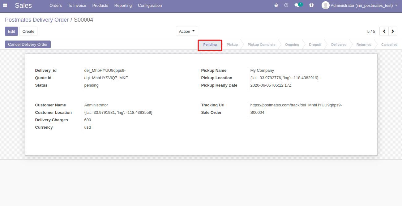 Postmates Odoo Integration FeaturesIntegration between Odoo and PostmatesSimpleConvenientConfirmation of Sales Order Leads to Delivery Order GenerationAdd a product into cartPostmates Estimated PricePostmates Delivery PriceSO Generation through websiteConfirmation of Sales OrderGeneration of Delivery OrderBooking Order in PostmatesOrder DetailsView of Postmates Delivery OrderPostmates DetailDelivery Order in PostmatesStatus change in Delivery Order based on PostmatesRelated ProductsOdoo Dunzo Connector IntegrationOdoo Delivery Driver BoyShip-Rocket Odoo ConnectorOdoo Home Delivery Control System for any BusinessHome Delivery All-in-One POS, Website and Mobile Orders